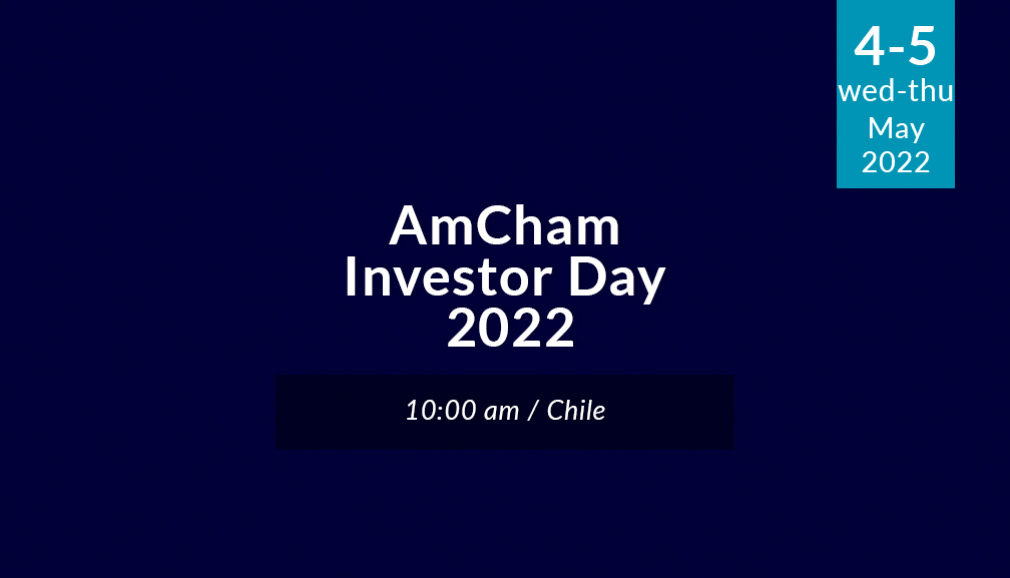 AmCham Investor Day has been set up to promote Chile as a destination for investment and to enhance the country’s competitiveness with a focus on sustainable investment, ESG and Venture Capital. The virtual event will take place at 10 am on May 4 and 5, 2022 and will feature public and private sector speakers.