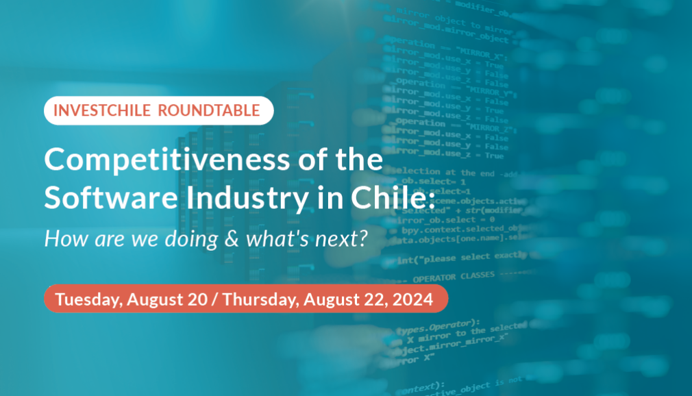 InvestChile is organizing the roundtable ‘Competitiveness of the Software Industry in Chile: Where We Stand and What’s Next?’ where representatives from foreign IT companies established in the country will participate to discuss projections, growth opportunities, and challenges to accelerate reinvestment in the sector. Topics such as access to digital talent, legal and labor framework, government incentives, and regional expansion will be addressed. The event will take place on Tuesday, August 20, and Thursday, August 22, in Santiago, Chile.
