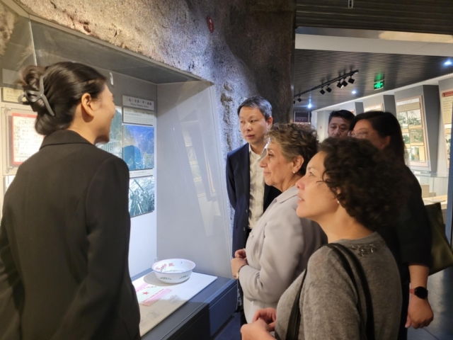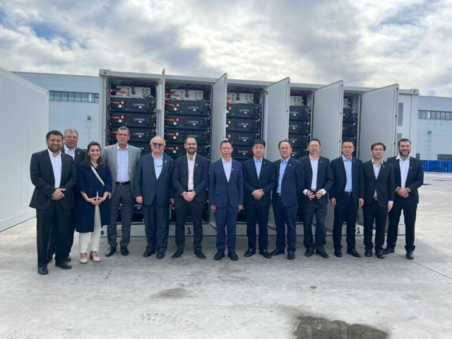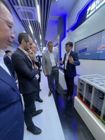El ministro Grau, en compañía del agregado de InvestChile en Asia, Vicente Pinto, y de la Coordinadora de Redes Internacionales de la agencia, Catalina Pérez, realizó un recorrido por el centro de almacenamiento energético de XYZ Storage, uno de los principales proveedores de soluciones de Battery Energy Storage System (BESS) en China y filial de SPIC (matriz de Pacific Hydro).