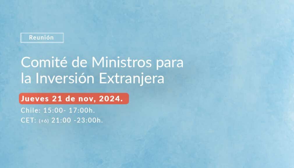 El Comité de Ministros para la Inversión Extranjera -compuesto por el Ministro de Economía- Nicolás Grau, Subsecretaria de Minería-Suina Chahuán, Subsecretaria de Relaciones Exteriores Claudia Sanhueza, Ministra de Obras Públicas- Jessica López y la Directora de InvestChile, Karla Flores- se reunirá el jueves 21 de noviembre en una reunión donde se expondrá el estado de la IED en Chile y los datos actualizados sobre la cartera de InvestChile.