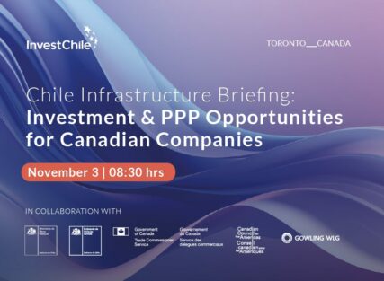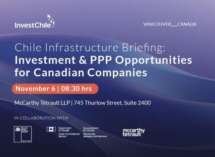 InvestChile, McCarthy Tétrault, el Servicio de Delegados Comerciales de Canadá y el Consulado General de Chile en Vancouver organizan una sesión informativa exclusiva sobre oportunidades de inversión en el mercado de infraestructura de Chile, desarrollo y modernización de infraestructura portuaria. El encuentro se llevará a cabo el jueves 6 de noviembre, de 08:30 a 10:30 […]