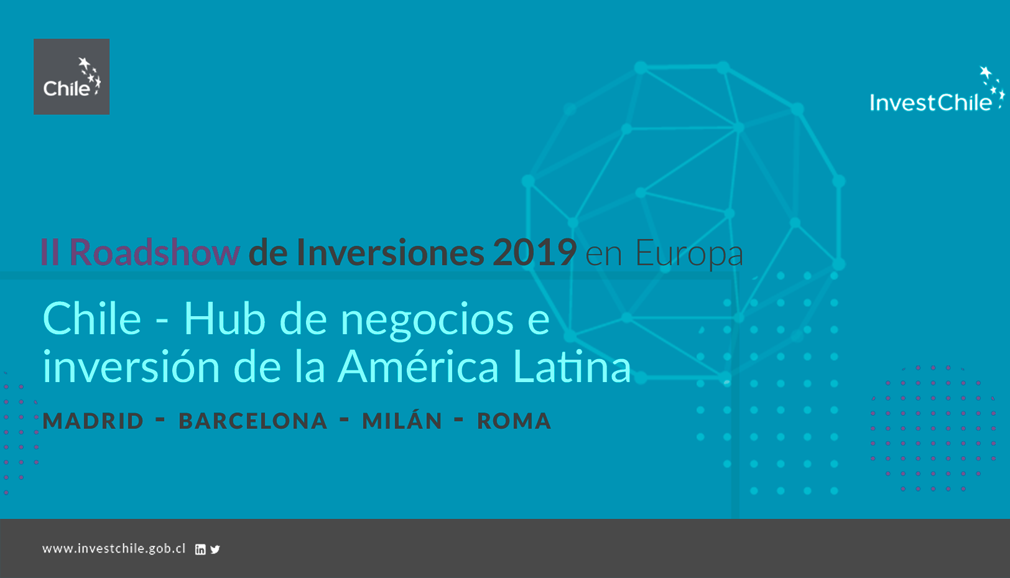 Del 30 de septiembre al 5 de octubre, la delegación de InvestChile realizará un Roadshow de inversión y oportunidades de negocios en Europa para promover a Chile como un centro de negocios e inversiones en Latinoamérica. La delegación estará encabezada por el Director de InvestChile, Cristián Rodríguez Chiffelle.
