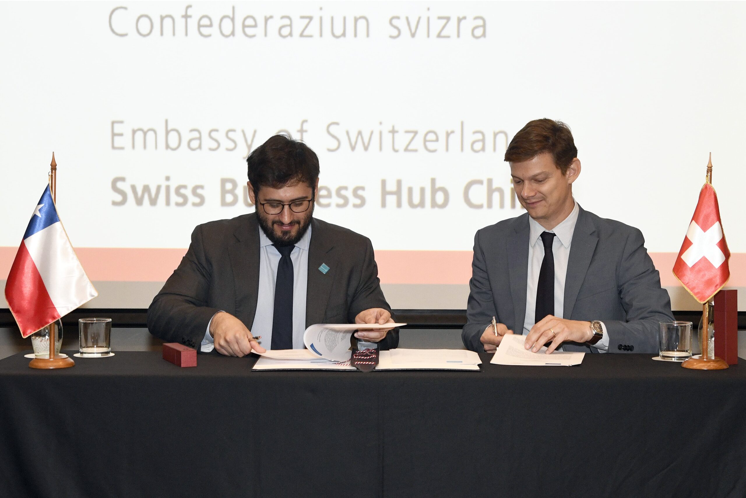 El Director (s) de InvestChile, Juan Pablo Candia, y Adriano Bürgi, Regional Manager Americas Export Promotion & Global Network de Switzerland Global Enterprise (S-GE), firmaron un nuevo Memorándum de Entendimiento (MoU) que renueva la colaboración estratégica entre ambas instituciones.
