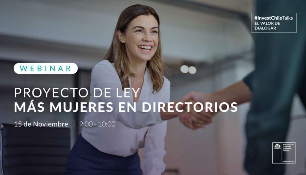 El año 2022 fue presentado al Congreso el proyecto de ley “Más Mujeres en Directorios”, que busca aumentar gradualmente su participación en directorios de empresas abiertas y especiales. En el marco de este proyecto de ley, InvestChile y el Ministerio de Economía, Fomento y Turismo le invitan a participar del Webinar: Proyecto de ley más mujeres en directorios: alcances y aspectos claves, el cual se llevará a cabo el día miércoles 15 de noviembre a las 9:00 am.
