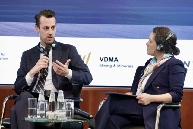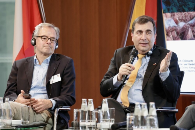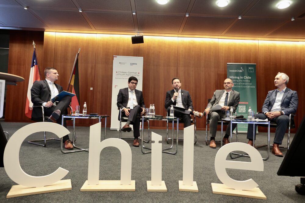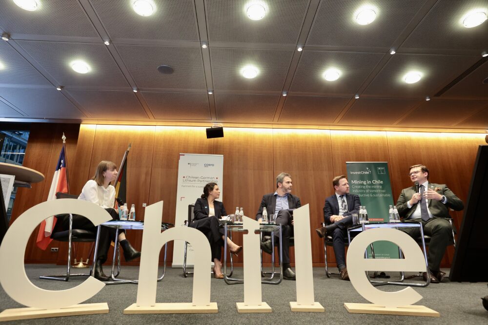El segundo bloque, “Chile & Europe – Can We Build a Sustainable Industry Together?”, contó con Hernán Cáceres, director del Instituto Nacional de Litio y Salares (InLiSa); Stefan Debruyne (SQM); Sven-Uwe Schulz (Instituto Federal de Geociencias y Recursos Naturales – BGR); y Jean Paul Gueneau de Mussy (Instituto Europeo del Litio – eLi), moderado por Francisco Orozco, agregado de Industria y Tecnología de la Embajada de Chile en Alemania.