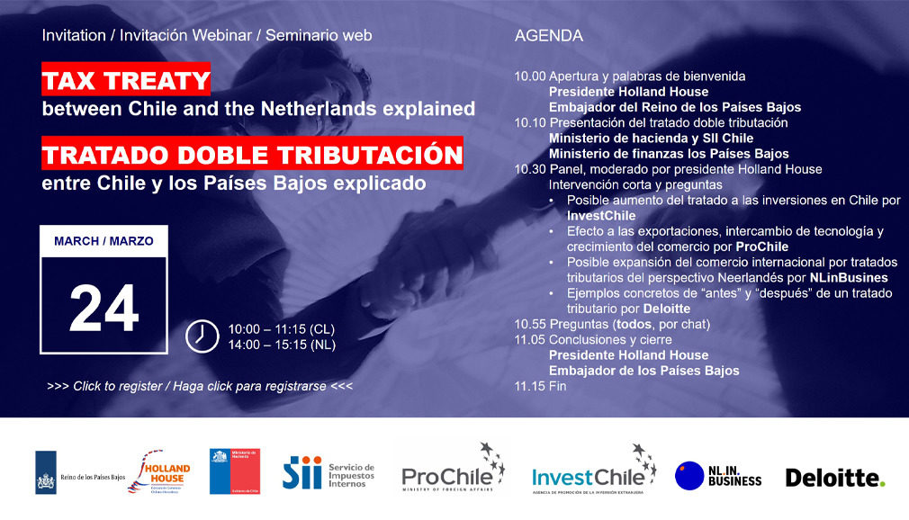 Chile y ´los Países Bajos firmaron un tratado fiscal que evitará la doble tributación. Después de la ratificación por ambos parlamentos, este tratado estará operativo (previsto para finales de 2021). En este webinar intentaremos explicar el por qué, el qué y el cómo. Expositores de ambos equipos de negociación, de oficinas de promoción de exportaciones e inversiones y ejemplos concretos de «antes» y «después» de Deloitte, basados en otros tratados, darán una buena idea de cómo esto podría afectar positivamente el comercio entre Chile y los Países Bajos.