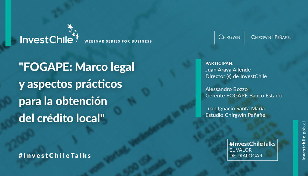 InvestChile, la Agencia para la Promoción de la Inversión Extranjera del Gobierno de Chile, y el estudio de abogados Chirgwin Peñafiel, tienen el agrado de invitarlo al webinar FOGAPE: Marco legal y aspectos prácticos para la obtención del crédito, que contará con la participación de Alessandro Bozzo, gerente FOGAPE Banco Estado. El evento se llevará a cabo el próximo viernes 5 de junio, a partir de las 9:00 hrs.