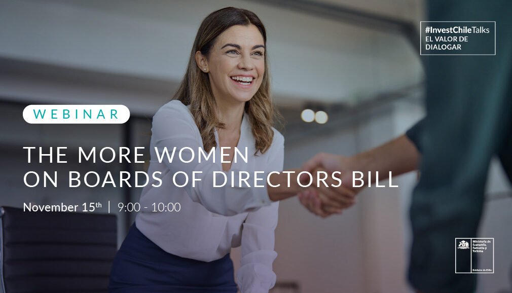 Submitted to Congress in 2022, the “More Women on Boards” bill aims to gradually increase female participation on the boards of directors of publicly traded and special companies. In that context, InvestChile and Chile’s Economy, Development and Tourism Ministry invite you to participate in The More Women on Boards of Directors Bill: Scope and Key Issues webinar on Wednesday, November 15 at 9:00 AM.
